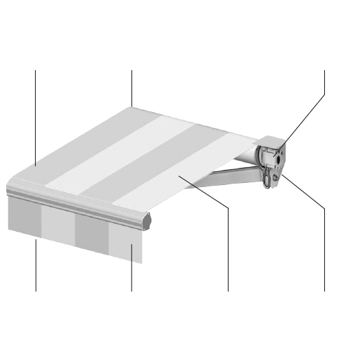 Die Lieferung besteht aus dem auf Walze und Saumrohr aufgezogenen Stoff, den Armen und den vormontierten Kleinteilen wie Konsole, Getriebe, PVC-Lager, etc.